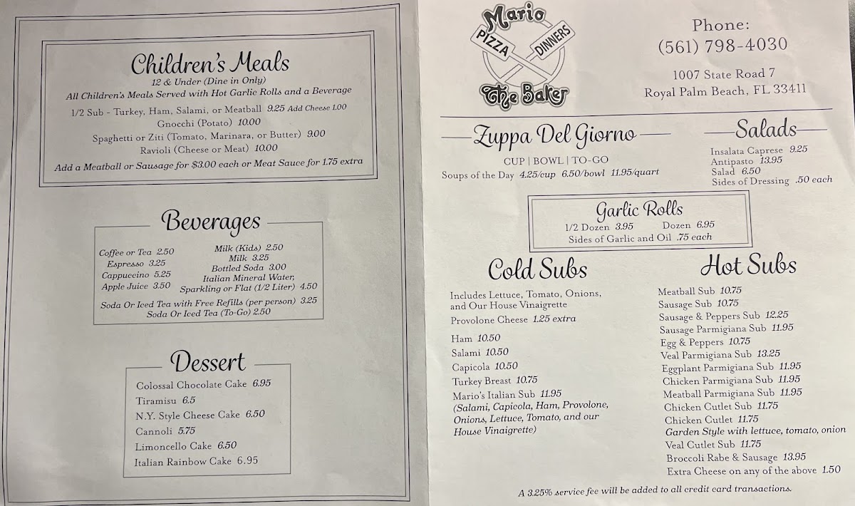 Welcome to The Original Mario the Baker, a beloved Italian eatery located at 1007 N State Rd 7, Royal Palm Beach, FL. This establishment prides itself on delivering authentic Italian flavors with a warm atmosphere that invites all to indulge. The menu boasts an impressive lineup of dishes, including savory hot subs like the Meatball Sub and Chicken Parmigiana, each crafted to perfection. For pasta aficionados, options like Spaghetti with Meat Sauce and Gnocchi Sorrentina are sure to impress.